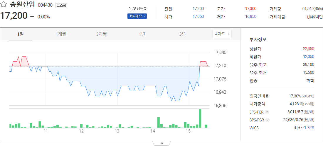 - 동사는 1965년 화학제품의 제조, 가공 및 판매를 위해 송원산업주식회사로 설립되었으며, 1977년 유가증권시장에 상장됨